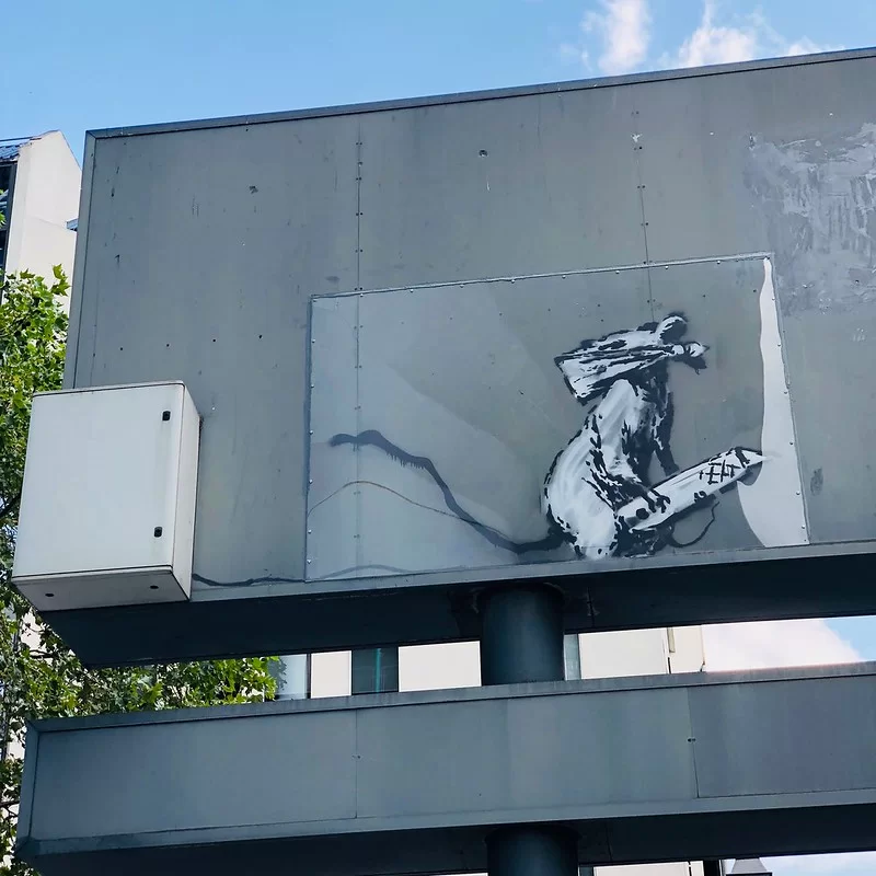 Одна из работ поселилась на указателе улиц возле центра Помпиду. Крыса угрюмо озирается, в руках у нее канцелярский нож, а половина мордочки спрятана под банданой. Так, по мнению Бэнкси, зарождалось трафаретное искусство.